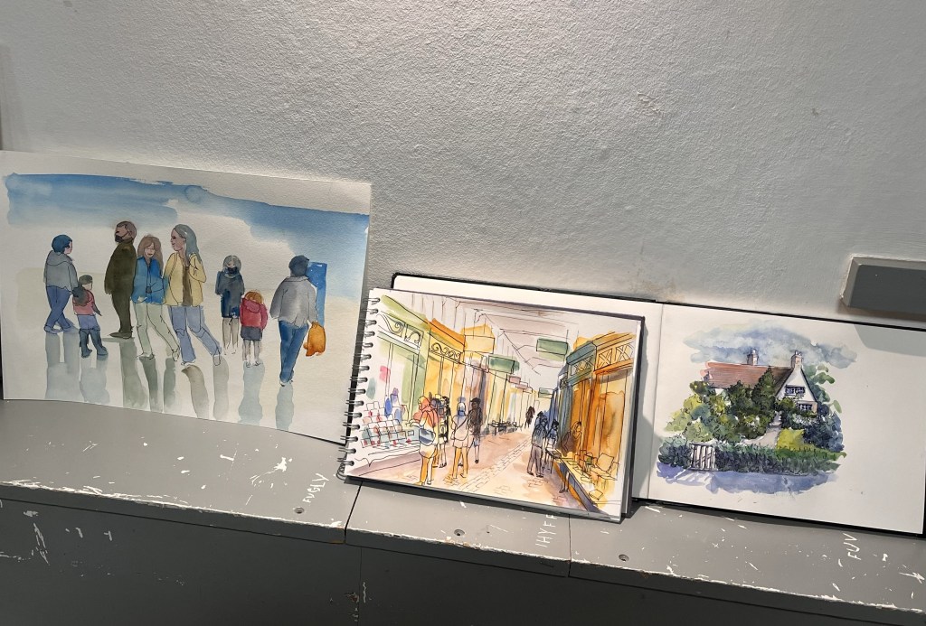 I did a workshop on Urban Sketching at the art society this afternoon. I set the artists a task to do a scene putting paint down first then drawing when it was dry. Most of them hadn’t tried this before but produced some great results.