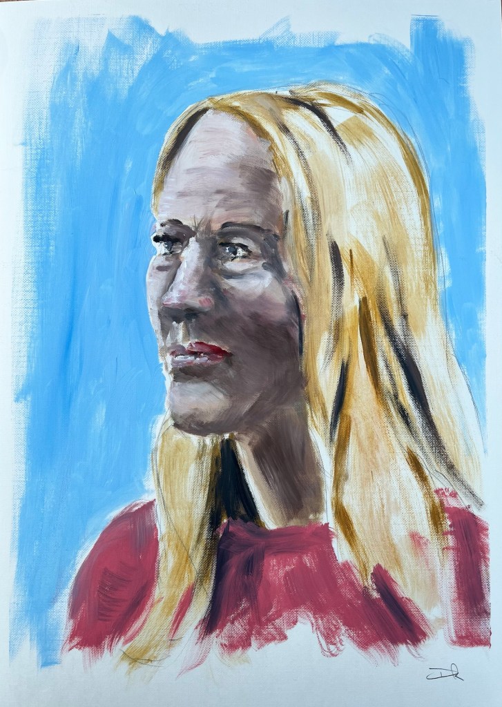 Las sat for her portrait at Broadstone Art Society this morning in a lovely magenta jumper. I used oils with a zone pallet which is limited to red, yellow ochre black and white plus blue for the background. I know it’s possible to mix great flesh tones because a lot of Dutch old masters used this pallet but I couldn’t make it work, the skin tones are way off.