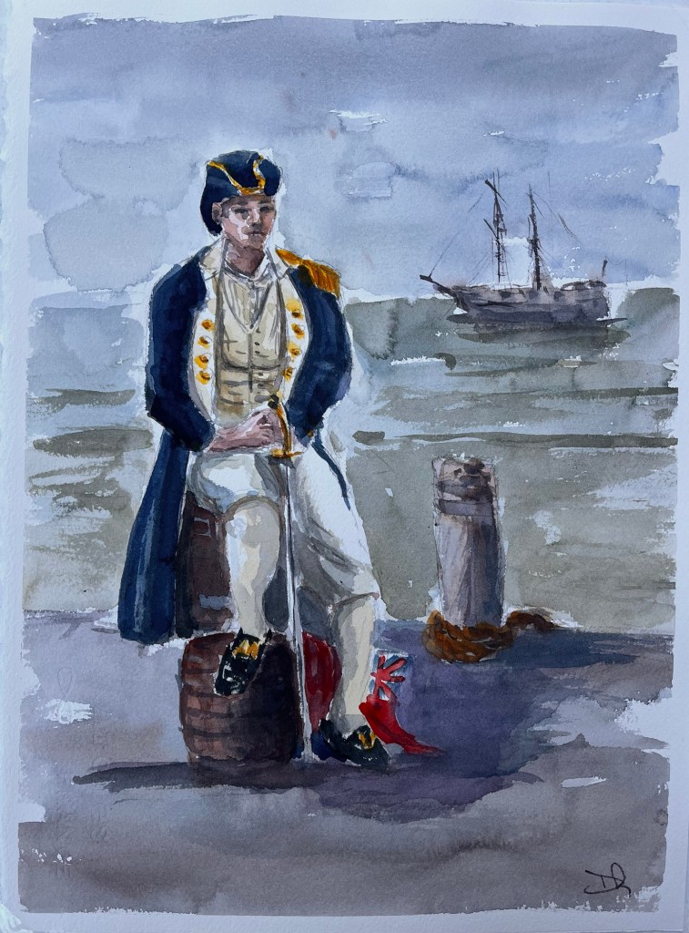The week before last Lyndsey Procter sat for us at Poole and East Dorset art society. Lyndsey wore her Commander’s uniform from the Royal Navy in the Napoleonic era complete its dress sword. I moved her from the hall in the community centre to a more nautical location. I didn’t manage to finish this one on the day so I at last got round to it today.