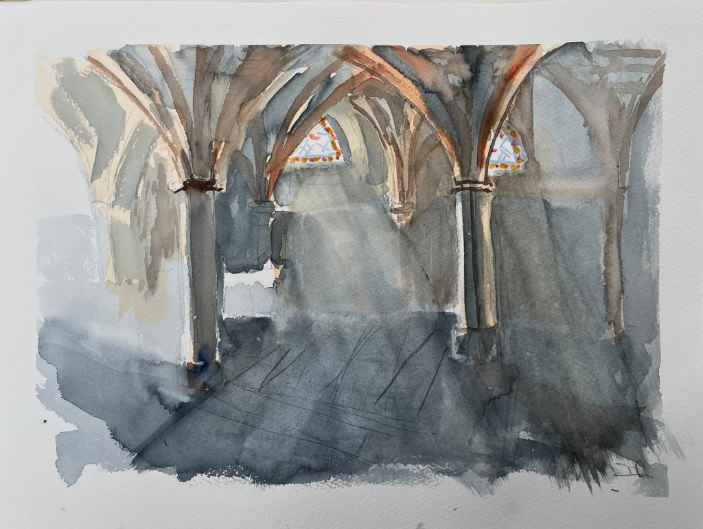 A visit to Wimborne Minster with Poole and East Dorset Art society this morning. I had got permission for us to paint inside the Minster and it was a great experience. Parts of the Minster date back to Saxon times so there’s plenty to discover. The chained library has books that are hundreds of years old and historians that are very enthusiastic and knowledgeable. I painted the light in the crypt.