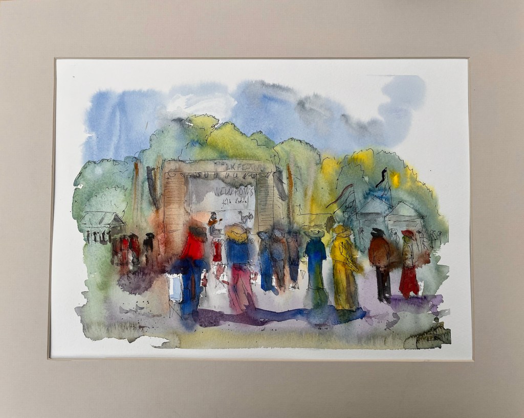 Anther painting from the New Forest Folk Festival, this time I splashed paint around first then drew into it. It’s a bit different to my usual but I. Think it looks ok in a mount.