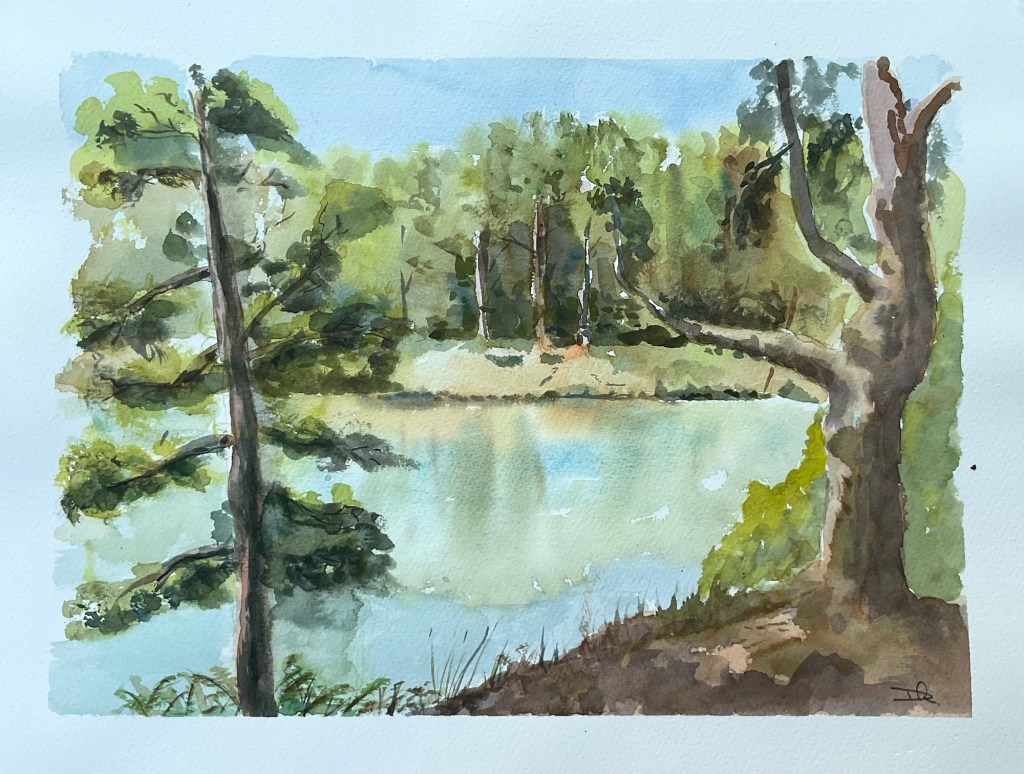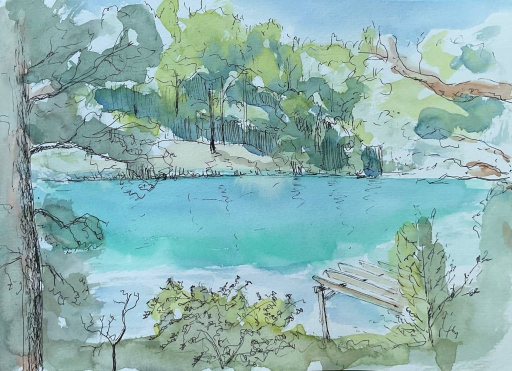 Today’s outing with Poole and East Dorset Art Society was to Blue Pool near Wareham in Dorset. It’s a beautiful place to paint on a warm sunny day and I enjoyed doing a watercolour and a quick pen and wash sketch. I’m just recovering from a bout of COVID and came home exhausted but it was good to be out again.