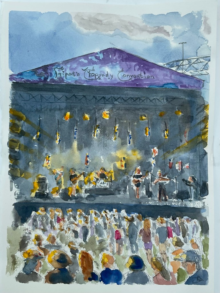 Another painting from the festival. I can’t remember who was on stage at the time, it may have been two different bands!. Watercolour on Saunders Waterford paper.