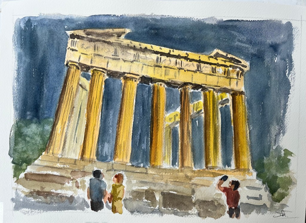 Just back from a few days in Athens with good friends. The archeological sites are wonderful and the. Crowning glory has to be the Parthenon sitting on top of the Acropolis. It’s a steep climb but well worth the effort. We visited in the early evening as the light was better and it was cooler, it was still extremely crowded so I took photos and painted this back in the hotel.