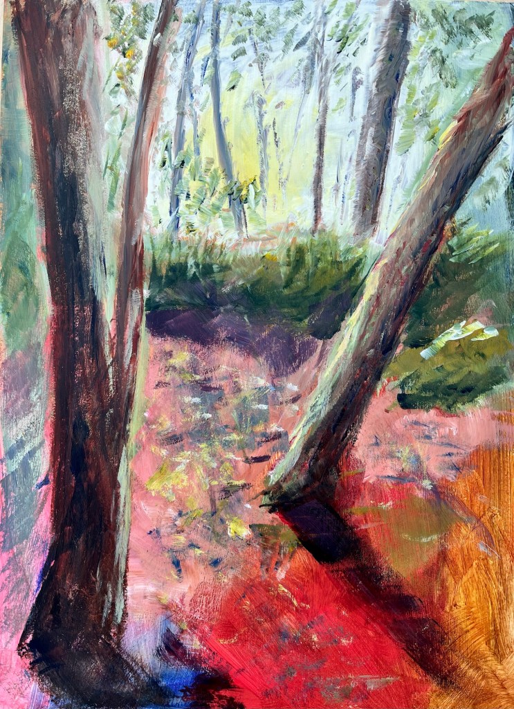 On Tuesday we had a workshop with Broadstone Art Society on acrylics with Chris who encouraged us to paint over old paintings to let the colours shine through. I didn’t have any old paintings with me so I splashed some colour on the board and once it was dry painted this woodland scene. It’s a technique I will certainly use again.