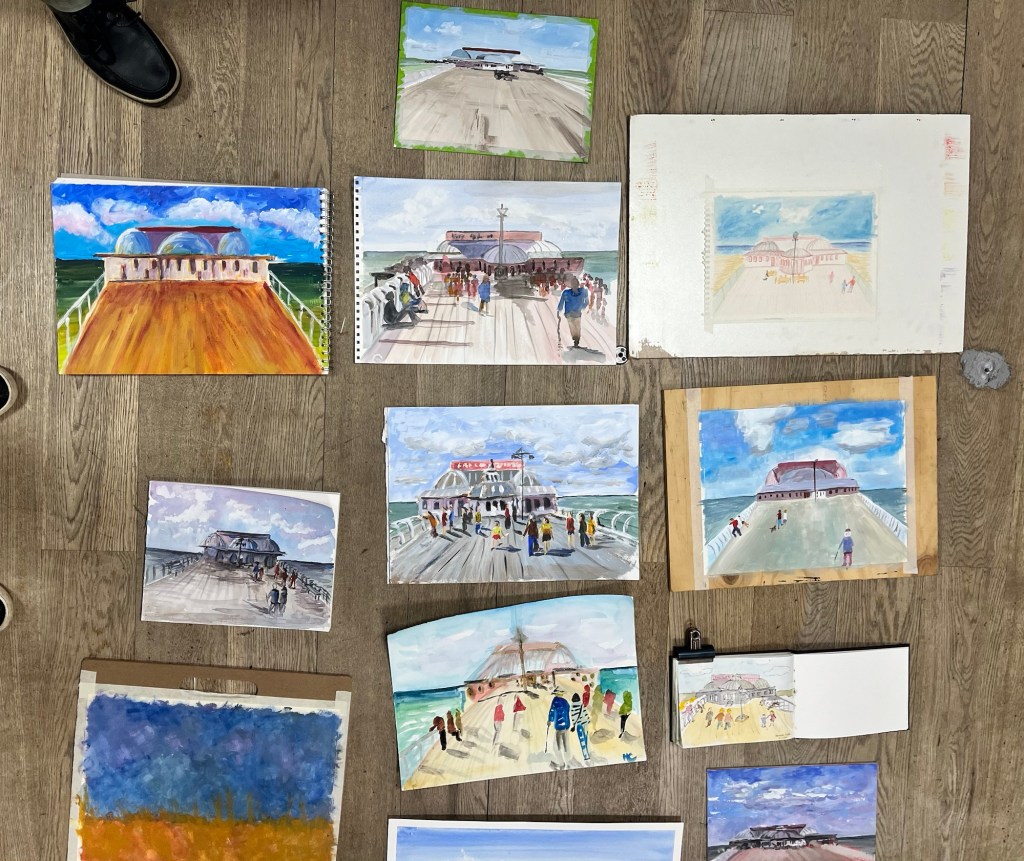 We watched an extract from a dvd on painting Cromer pier by Adebanji Alade atPoole and East Dorset Art society today. members then had a go themselves. Interesting to see how different they all are.