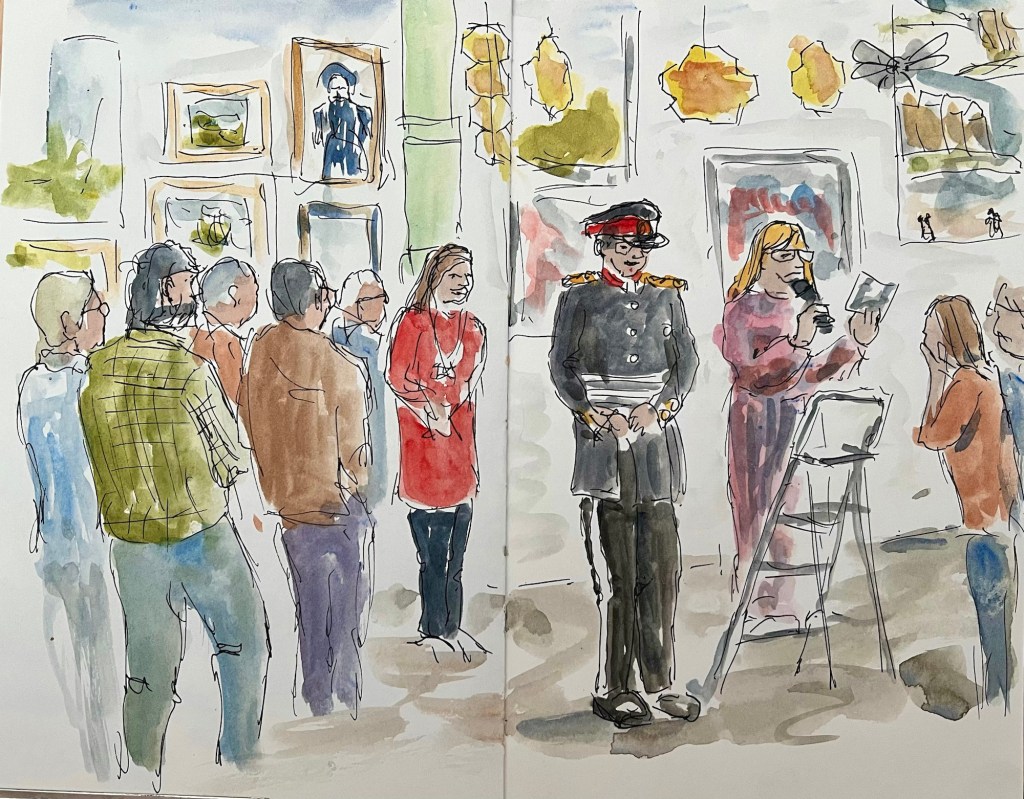 At the opening of the Art In Poundbury winter exhibition “a hive of creativity” this morning. the opening ceremony was performed by the Lord Leuitenant of Dorset Micheal Dooley LVO MMs FRCOG. I was sketching the opening and was pleased to be introduced to him afterwards, he was very complimentary about my sketch which was extremely gratifying.