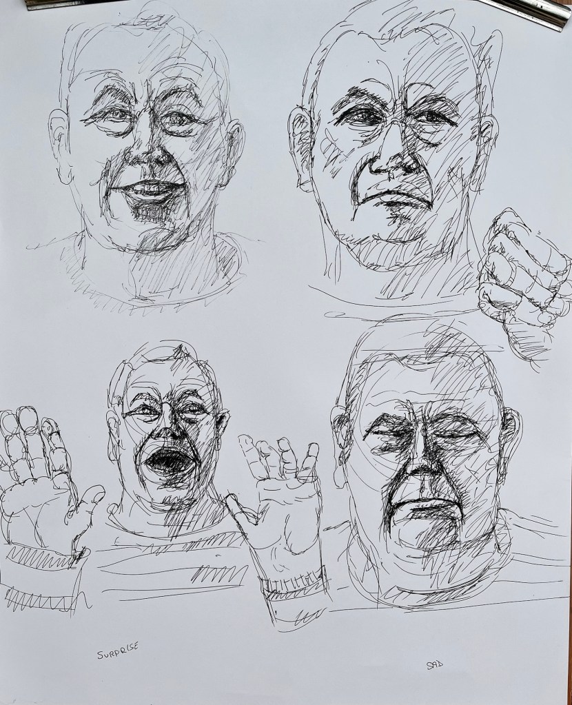 Garry sat for us at Broadstone Art Society this morning. We started with a straightforward portrait then after the break Garry entertained us with four 15 minute poses showing expressions of anger, surprise, sadness and a cheesy grin! It was a lively session and seemed to be enjoyed by everyone.