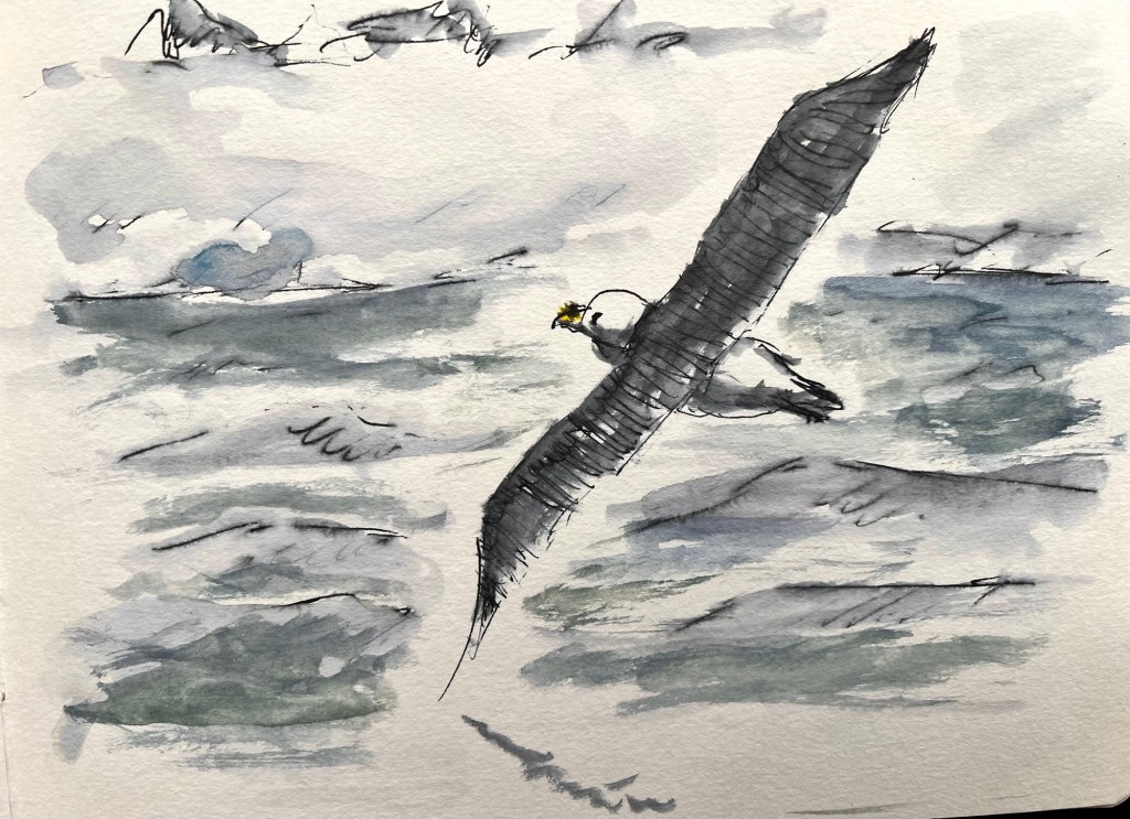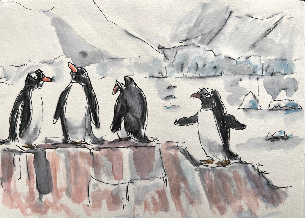I haven’t posted for a while because I have been in Antartica where the wi fi on board ship was a bit too slow to process photographs. I have a fair number of sketches and paintings that I need to sort out over the coming weeks. On the flight home I took some time to do a few sketches from memory to attempt to fix some of the amazing things I was lucky enough to see, here are a couple of them.