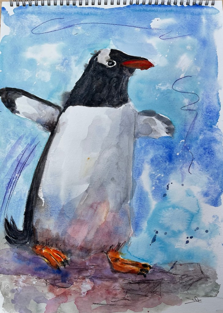 An interesting session this afternoon at Poole and East Dorset Art Society with artist Janet Wiley. Janet encouraged us to used mixed media to create interesting backgrounds before painting an animal of our choice. I chose a penguin of course!