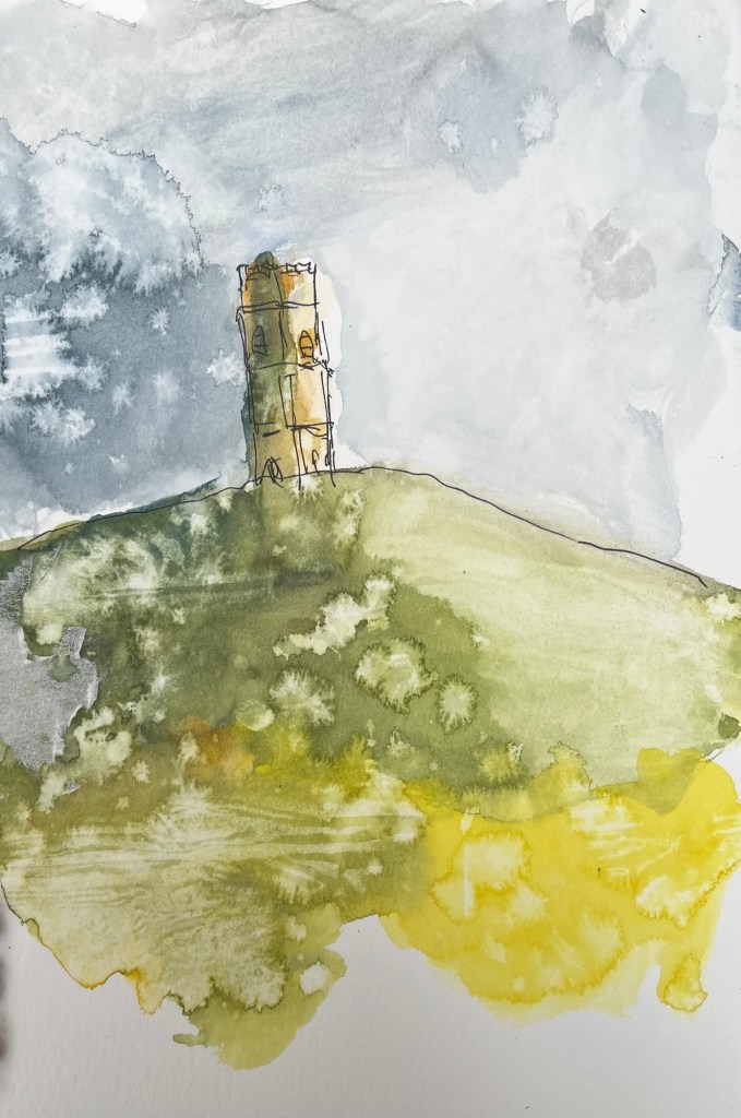 Fletcher and I climbed Glastonbury Tor this afternoon. It was a steep climb from our campsite to the bas of the tor and another steep climb to the top so I expect to ache tomorrow! As I did a quick sketch it started to rain but I think the rain spots add interest.