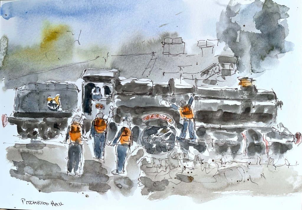 A couple of weeks ago I visited Swanage railway where they had a steam weekend. There’s always plenty to sketch around the railway but this time I was spoilt for choice. It was fascinating to sketch the railway engineers greasing and oiling the Pitchford Hall ready for its run to Norden and back.