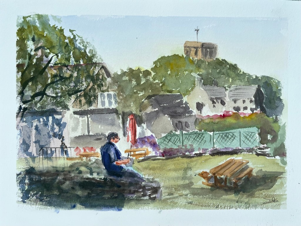 Today’s plein air at the Scott Arms, Kingston where they kindly allowed us to use the garden to sit and paint the magnificent view over Corfe Common or any other scene we wanted to paint. I chose to look in the other direction and paint the garden, houses and distant church.