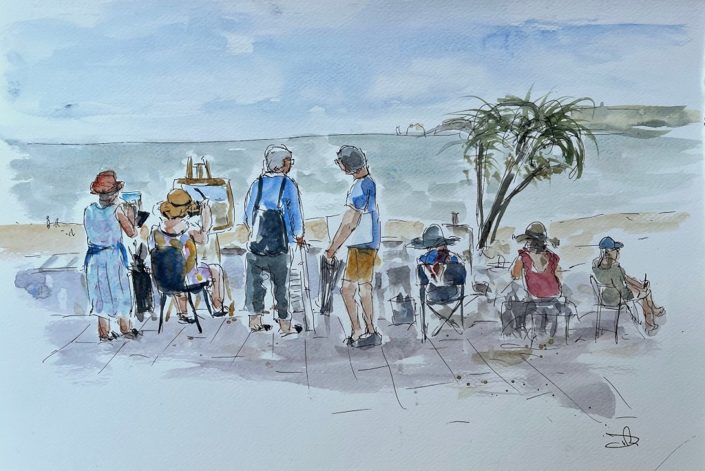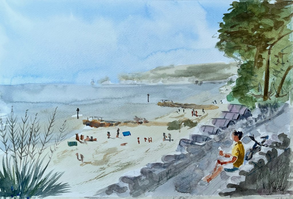 A day at the beach with Poole nd East Dorset Art Society. We hired the hut at Dursley Chine so we could have demos, tea and coffee and a place to retreat to in case the weather turned against us. Of course it was warm and sunny all day so we were all able to paint on the terrace overlooking the beach. We even had a couple of demos outside, I did one in the morning and Tom Marshall after lunch. It was a very good day.