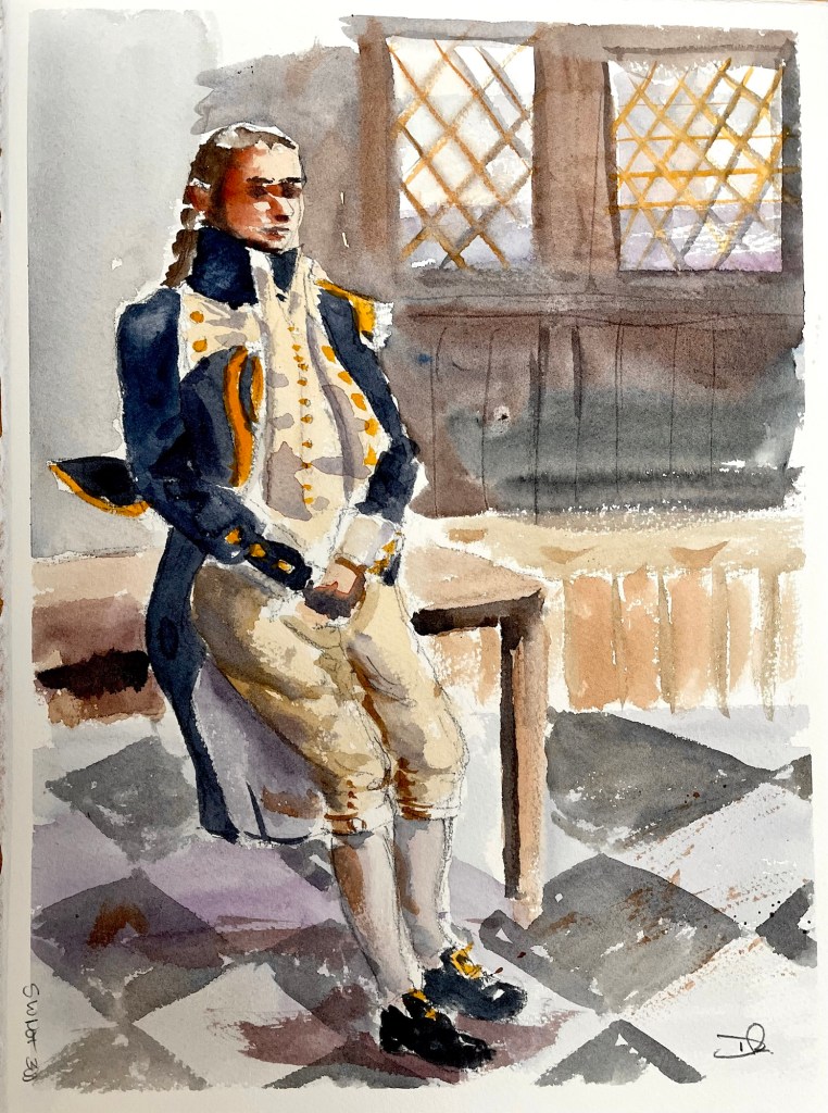 Lyndsey posed for us yesterday at Poole Art Society. She wore her Master and commander uniform from the Napoleons era. All made herself using authentic materials such as linen and wool. Lyndsey did two twenty minute standing poses followed by 45 minutes seated. I managed a couple of pen and was sketches and a watercolour. Members did some great work in various mediums.