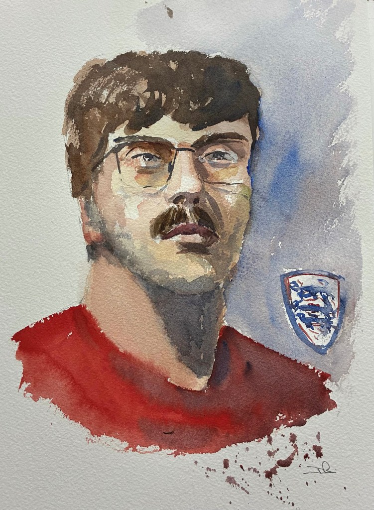 We had a younger male model at Broadstone Art Society this morning. Sam is on a gap year and hoping to go to Canada once he has saved enough. He’s a loyal West Ham supporter and was wearing a three lions shirt, I couldn’t fit the badge in so I moved it to the background, artistic licence!