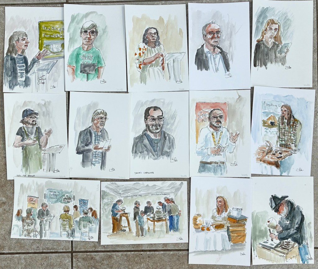 As part of my duties as Artist in Residence to the Lord Lieutenant of Dorset I spent the day sketching at the Dorset Heritage and Harmony conference at Kingston Maurward. There were a lot of heritage crafts represented including stone carving, violin and bow making, brewing, spinning and weaving. I did a 18 sketches, three of which I gave to a higher cause!